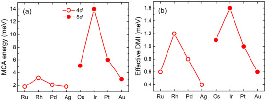 Here denotes the Gilbert damping parameter. When is the gyromagnetic ratio, represents . is the effective magnetic field at site i, and is the thermal noise. The LLG simulations were done with mumax3 [32]. For the present systems we use material parameters obtained from DFT: K = 2–14 meV and D = 0.2–1.6 meV (see Figure 2). To verify the numerical stability of the simulations, calculations with different cell sizes were performed. Finally, the thin films are discretized in a 400 × 400 × 2 mesh with periodic boundary conditions in in-plane directions.