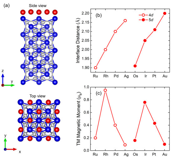 The in-plane lattice constant of 7.32 Å was taken from the experimental lattice constant of Laves phase of GdFe, with lattice mismatches of 3.6% (Rh)–14.2% (Os), as depicted in Figure 3a. From the total energy calculation, it was confirmed that the hollow site is the most energetically favorable to stack the TM layer (see Figure 3). The atoms of GdFe and TM capping layer were fully relaxed by atomic force calculations.
