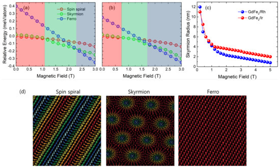 A skyrmion can be considered to be an intermediate state between spin spiral state and ferromagnetic state in a magnetic material because it rises from the competition between the exchange interaction that is responsible for the ferromagnetic state and the anisotropic exchange that generates spin spiral behavior. To investigate the magnetic phase transitions in GdFe/Rh and GdFe/Ir under the external magnetic field at 0 K, we have performed atomistic spin-dynamics simulations using the model described by Equation (1). Using the parameters obtained from DFT, the magnetic phase diagrams is displayed in Figure 4a,b. For both films capped by Rh and Ir, the ground magnetic state is a spin spiral consistent with the energy minimum at zero applied magnetic field. However, for the film capped by Rh, the skyrmion lattice is energetically stable at a critical field value of ∼1.12 T, and this skyrmion lattice phase is changed to the ferromagnetic phase by a larger critical field value of ∼2.25 T. For the film capped by Ir, the skyrmion lattice emerges at relatively weak field of 0.75 T, and disappears for a large filed of ∼1.74 T.