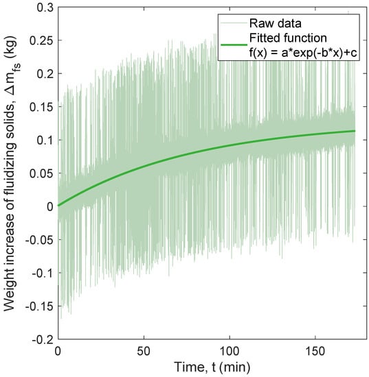The cold flow model was placed upon a scale which logged the total system weight over the duration of each experiment, and weight increase logged then corresponded to the mass of water adsorbed on the particles. Using this data together with the recorded moisture content of the air, a mass transfer rate coefficient, k, was calculated according to Equations (1)–(4). The water vapor concentration in the bulk of the gas was calculated assuming a logarithmic mean of the in- and outgoing concentrations, Equation (2). The concentration of water on the particle surface was calculated by performing a calibration experiment. In the experiment the fluidizing solids were completely saturated with water. Knowing that the concentrations on the particle surface and in the bulk gas were equal at this point, a material dependent coefficient, α, was obtained (Equation (4)). For the material used here α = 0.0241 kg/m3. Assuming linearity, this corresponds to a Henry’s law constant of 0.36 g/g, to be compared to e.g., [19] who report a value of ca. 0.44 g/g for Davidson Bead Gel.