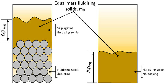 Overall pressure drop as well as segregation between fluidizing solids and packing solids were assessed through pressure measurements. When fluidizing a stationary confined fluidized bed consisting of fluidizing solids and packing solids with a total height equal to the upper pressure tap, the bed expands and the inventory of fluidizing solids above this upper pressure tap can be easily determined (Figure 3). With this, the voidage of the fluidizing solids inside the voids of the packing solids, , can be calculated, as presented in Equations (5) and (6).