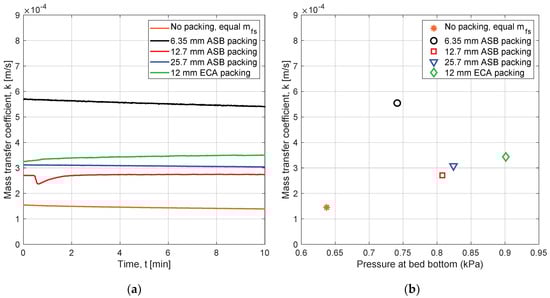 The mass transfer coefficient was found constant in the time period selected, suggesting that adsorption was mass transfer controlled (as opposed to kinetically controlled), see Figure 5a. An improvement in mass transfer by a factor 1.9–3.8 was found under the conditions tested here, see Figure 5b. The largest improvement was observed using 6.35 mm ASB packing solids and the smallest improvement was with the 12.7 mm ASB packing solids. ECA packing solids performed better than the 12.7 and 25.4 mm ASB packing solids and gave an improvement of a factor 2.4. No splash zone formed in the experiments using ECA packing, as opposed to ASB packing.