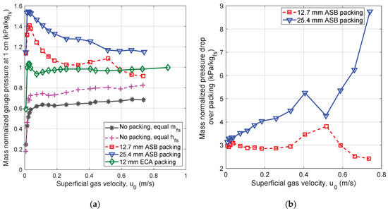 (a) Pressure drop of a fluidized bed with or without packing, normalized by total mass of fluidizing solids. (b) Pressure drop over the packing of a confined fluidized bed of a certain height, normalized by mass of fluidizing solids inside the packing.