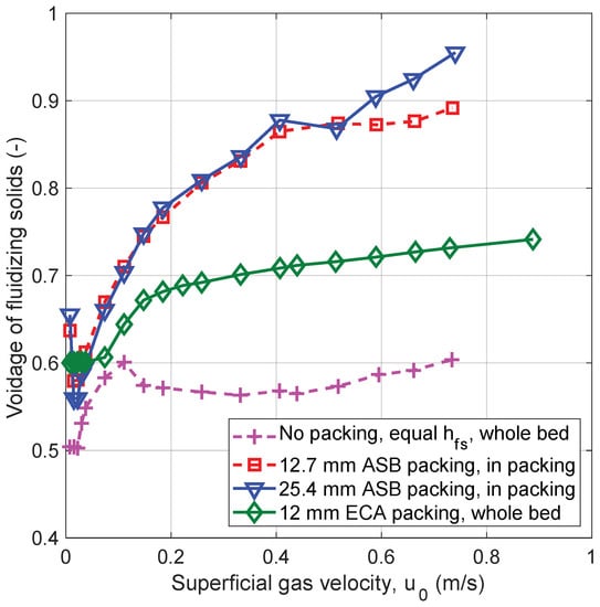 Six different cases were tested, as presented in Table 2. ECA packing and fluidizing solids did not segregate under the conditions tested but mixed to a large extent. Thus, the bed expansion, Xexp, was used to indicate an average voidage of the fluidizing solids, see Equations (7) and (8), assuming that the void space of the packing solids increased linearly with the bed expansion.