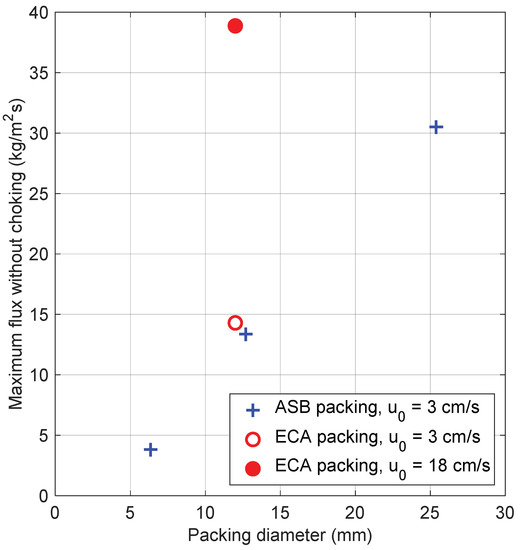 The maximum vertical crossflow of fluidizing solids through the packing solids was measured. A device was constructed to allow the pouring of fluidizing solids at a constant rate. It consisted of a funnel shaped reservoir with sharply inclined walls, where the bottom opening was attached to a knife gate valve. The valve had previously been calibrated by measuring the time it took to pour a certain mass of solids on to a scale. A known mass flow of solids could thus be poured by adjusting the opening of the valve. By pouring the fluidizing solids over packing suspended on a platform covered by a coarse metal mesh, through which the fluidizing solids could move freely within the range of solids fluxes investigated, a maximum rate could be found (Figure 4) before a choke point was reached and fluidizing solids started building up on top of the packing. A small amount of gas at u0 = 3 cm/s was added from below in order to prevent bed material from getting stuck in the packing, while staying well under conditions where the gas velocity inside the packing voids would be so high that it pushes the fluidizing solids back up. Due to the ability of ECA packing to enter another mode of fluidization where the packing is fluidizing and suspended by the particles, an additional point with a higher velocity of u0 = 18 cm/s was tested for ECA packing and, for comparison, the similarly sized 12.7 mm ASB packing.