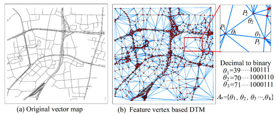Given that topological relation and angles in vector maps are resistant to geometric attacks [49,50], this study first constructs Delaunay Triangulation Mesh (DTM) based on the feature vertices and then produces zero-watermark of high capacity and strong robustness by using angles in the DTM as feature information the feature vertices [51]. The specific steps are as follows: