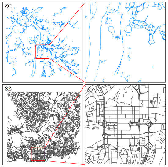 Two different vector maps were used to evaluate the proposed scheme. One 2D vector map of the water distribution in Zengcheng (Figure 3, denoted by ZC) was used to represent environments with irregular and uneven distributed map elements, and another 2D vector map of the road distribution in Shenzhen (Figure 3, denoted by SZ) was used to represent environments with regular and relatively evenly distributed elements. The projections of the vector maps are local plane projection coordinate systems, namely Zengcheng independent coordinate system for ZC and Shenzhen independent coordinate system for SZ, respectively. Given that polygons could be seen as polyline sets, we obtained 77,343 vertices and 1848 polylines in ZC, 128,069 vertices and 4683 polylines in SZ.