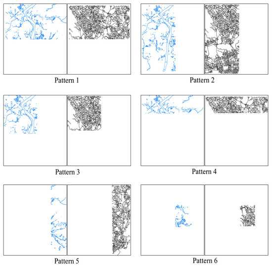 Different cropping patterns. Pattern 1 cropped the lower half of the original maps by approximately 1/2. Pattern 2 cropped the right half of the original maps by approximately 1/2. Pattern 3 left approximately 1/4 of the upper left corner of the original maps. Pattern 4 left approximately 1/4 of the first half of the original maps. Pattern 5 left approximately 1/4 of the right half of the original maps. Pattern 6 left approximately 1/8 of the upper right of the original maps.
