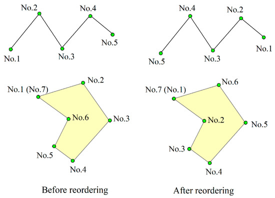 The object attack experiment mainly includes object deletion, object addition, and reordering of polyline vertices. The vector map watermarking scheme needs to resist object attacks such as deletion or addition of polylines, which are routine operations in cartography and map updating. The object addition experiment is to add polylines randomly to ZC and SZ at the ratio ranging from 5% to 60%. Different Object IDs are assigned to the added polylines to make them have certain attribute meanings and participate in relevant batch processing. In the object deletion experiment, polylines in ZC and SZ are randomly deleted in proportion, and the deletion intensity is increased gradually at the range from 5% to 60%. Similar to the vertex attack, both object deletion and addition experiments are performed for three times randomly with the same intensity, whereas the feature vertex watermarks, the non-feature vertex watermarks, and the dual watermarks are extracted accordingly. The reordering of objects and/or vertices is one type of attack that does not result in changes in images or data precision, but easily causes false traversal orders and influences the more common objects in vector geographic data. In Figure 5, two types of vertices reordering are performed, for both ZC and SZ.