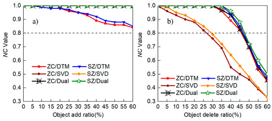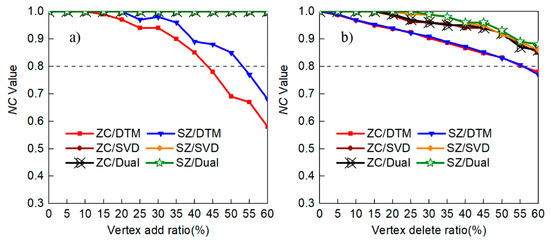 As shown in Figure 7a, our proposed method performs well under the object addition attack for both ZC and SZ. The NC values of the feature vertex watermarks, namely ZC/DTM and SZ/DTM, keep above 0.84 within the attack range and only decline slowly as the attack intensity increases. The NC values of the non-feature vertex watermarks, namely ZC/SVD and SZ/SVD, are always 1. Consistent with the non-feature vertex watermarks, the dual zero-watermarking schemes always have the NC values of 1 under the object addition attack. In Figure 7b, the DTM-based watermarks have the NC values of 1 for the first 35% deletion rate of the feature vertex watermarks and the quality of the watermarks greatly reduces as object deletion enhances. When more than 45% of objects are removed, watermarks could not be detected efficiently as the NC values are lower than 0.8. The SVD-based watermarks could not be effectively detected when the deletion ratio exceeds 25%. The dual zero-watermarking scheme maintains the same trend as the feature vertex watermark, showing that the proposed scheme is robust against both object addition and deletion.