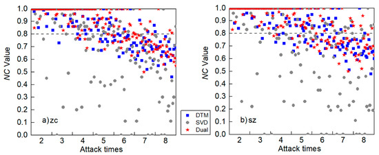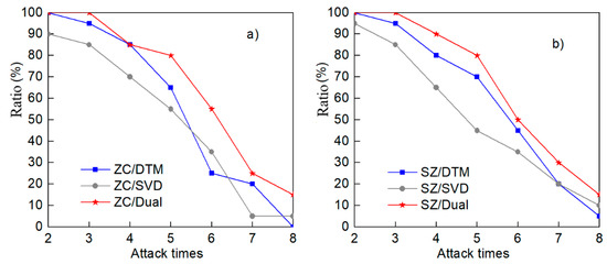 Figure 8 shows the distribution of the NC values for three types of watermarks in ZC and SZ under multiple compound attacks. The overall distribution trends under random compound attacks as shown in Figure 8a and b are similar, showing a downward trend with increased attack numbers. The NC values for both the DTM-based zero-watermarks and dual zero-watermarks roughly distribute between 0.5 and 1, whereas the SVD-based zero-watermarks have a range from 0 to 1. The NC values for the dual zero- watermarking scheme are significantly higher than those of both the feature vertex watermark and the non-feature vertex. Figure 9 shows that the ratio distributions of the watermarked images have NC values greater than 0.8 under compound attacks. As the attack numbers increase, the probability for detecting high-quality watermark images decrease and the chances to detect valid watermark information, even with eight attacks, is still non-negligible.