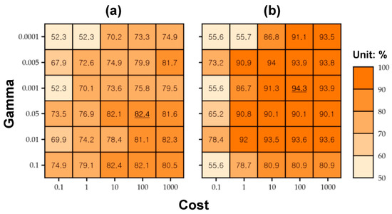 Cross-validation accuracy of SVM classifiers through a grid search. The case with the best accuracy is underlined: (a) using a single August image with VNIR and GK31 texture features; and (b) using six UAV images with VNIR and GK31 texture features.