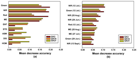 Mean decrease accuracy (MDA) values of input spectral and texture variables with respect to kernel size: (a) August image; and (b) multi-temporal images. ME: mean; ENT: entropy; ASM: angular second moment; STD: standard deviation; HOM: homogeneity; DIS: dissimilarity.