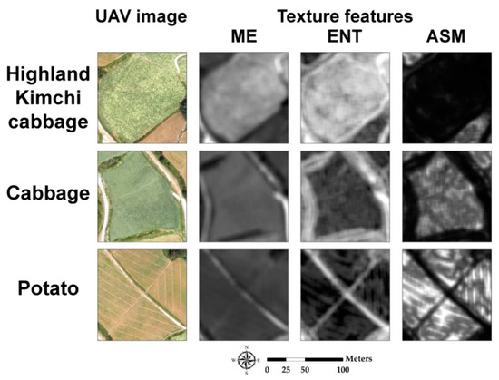For further qualitative inspection of texture features, some texture features in four subareas of GK31 are provided in Figure 8. Brighter colors represent larger values in each texture feature. ME, which is regarded as the GLCM mean, provides low-pass filtered spatial information that is useful to mitigate noise effects in the ultra-high-resolution UAV image. As an index for measuring the randomness of contrast distributions, ENT increased with greater change of brightness values between the center pixel and its neighboring pixels. ENT values for different classes appear in Figure 8. ASM, which measures uniformity of contrast, also changed with the four classes. This visual inspection of texture features further confirmed the usefulness of texture information.