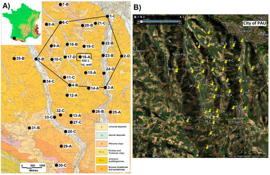 (A) Locations of the 36 monitoring points (35 different locations) plotted onto a geological map. The hexagon shape links the six geophysical observation boreholes for passive seismic monitoring down to 2 km-depth. Point 16-A is close to the location of the injection well (RSE-1). (B) Monitoring points plotted on Google Earth satellite view using shaded relief (afternoon view).