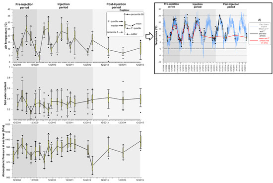 Figure 2 presents the temperature, pressure and soil water content evolutions during the 8 years of monitoring as monitored at each point during field acquisitions. The right insert details the atmospheric temperature data from Pau-Uzein airport, the data from the Barasol probe and the temperatures measured during sampling in the soil. As the thermal state of the atmosphere influences soil temperature, especially in the present case where soil temperatures were measured at shallow depth, the soil temperatures should be lower during winter than during summer, as shown by the whisker data. “Low season” soil temperatures mainly fall in a narrow range from 8.3 to 9.4 °C mean value. However, colder climatic conditions during the field surveys can cause strong temperature decreases in soil, as in March 2010 (mean value 4.3 °C); “Indian summer” conditions, on the contrary, can lead to soil temperatures over 10 °C, as in December 2012 (mean value 10.7 °C) and in December 2014 (mean value 10.3 °C). Annual climatic variations linked to the local conditions (temperate climate with oceanic influence), are thus reflected in the database, with statistically lower temperatures during winter, but these long-term trends can be overlapped by variations of higher frequency. These variations are partly linked to the geographical location of each monitoring point (e.g., hill slope oriented north and covered by trees vs. southwest oriented glade) and the time the measurements are performed.
