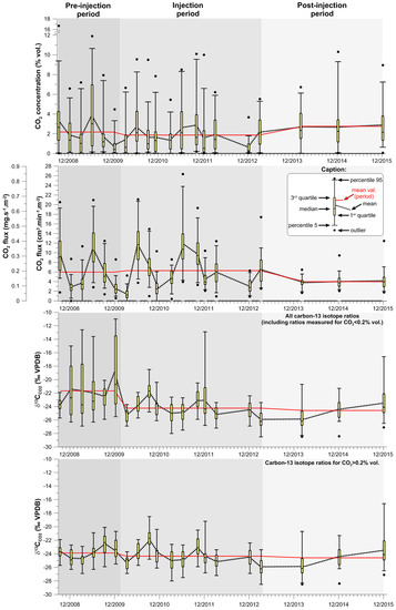 No significant difference of gas flux was observed between the baseline study from September 2008 to December 2010, and the injection period from January 2010 to March 2013. During these two periods, CO2 flux followed the expected seasonal pattern, without any significant deviation. The mean values measured during the baseline-study and the injection periods were almost the same, about 6 cm3·min−1·m−2. During the post-injection period, three field campaigns took place in winter; the mean value was about 4 cm3·min−1·m−2, which was very similar to the flux measured in winter during the baseline and the injection periods.