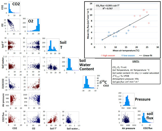 Plots representing soil temperature as a function of CO2 and O2 have the same shape. Two groups exist, one corresponding to “low season” data acquisitions, with soil temperature around 10 °C and less, and the other corresponding to “high season” data with a higher temperature (over 15 °C). When the data are considered as a whole, the relation between soil-gas concentrations and the soil temperature is masked: e.g., CO2 concentrations around 10% were monitored during both winter and summer. This is not contradictory with previous statements (see Section 3.2) that have established the mean CO2 concentrations were lower during the “low season”. This is only the result of considering the entire dataset in which local effects (topography, soil temperature, soil water content) are hidden. When the data are considered more in detail, the influence of temperature can be highlighted, e.g., for CO2-flux measurements that show a tendency to be higher when the temperature is higher (inset in Figure 4). Flux equal to zero is often measured during winter, when the soil temperature is only a few degrees Celsius and the air temperature hovers around 0 °C. Depending on the soil biological activity, gas flux is generally higher during “high season” but high flux, over 10 cm3·min−1·m−2, may be measured locally during the “low season”. This illustrates the effect of thermal draw on gas exchanges between soil and surface.