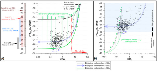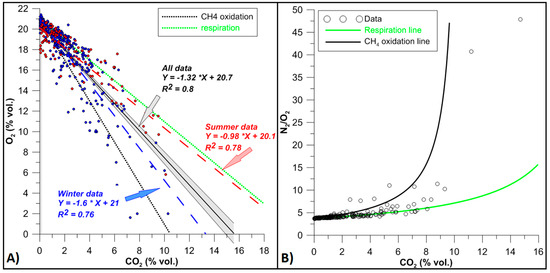 (A) Relationship between CO2 and O2 in soil gas and comparison to source attribution protocol defined by [59]; (B) Relationship between CO2 and N2/O2 in soil gas. Data fits are compared with control lines corresponding to CH4 oxidation and respiration processes.