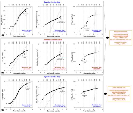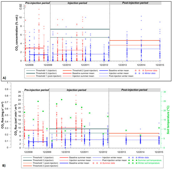 The thresholds were defined based on simple statistical considerations as there were little data available for defining universal threshold values that could be applied univocally to the Lacq-Rousse site. For example, in 2009, the potential leakage reported at the Kerr Farm, Weyburn oilfield, was not known [57,58], so that the criticality of threshold definition was not as clear. Nonetheless, it was agreed with the French authorities that these thresholds could be debated later and that they probably needed adaptation during the pilot experiment. The selected approach thus defined a “vigilance” mode as the mean value (M) plus twice the standard deviation (σ) of the baseline dataset (“vigilance” mode = M + 2σ), and an “anomaly” mode as the mean value plus three times the standard deviation of the dataset (“anomaly” mode = M + 3σ). The first attempts at defining the thresholds used the September 2008 to September 2009 dataset, as the December 2009 data were then thought to postdate the start of injection. The result was a set of high “vigilance” and “anomaly” levels (respectively 8.3% vol. and 11.2% vol. for CO2 concentration and 16.6 cm3·min−1·m−2 and 21.5 cm3·min−1·m−2 for CO2 flux). The operator then refined these levels by only considering the data acquired during “low season”, but this meant that the redefined threshold levels were only valid for the “low season” monitoring. This was approved by the administration. The question of what would happen if leakage was reported during the “high season” was not specifically addressed; further work would have been necessary, such as required when a threshold is exceeded during “low season”. Fortunately, soil-gas investigations and the use of a process-based method (defined as such by Romanak et al. [59], but used before) would certainly have provided sufficient evidence of the origin of the gas to reject any allegations of leakage. From analysis of the “low season” baseline data, the following cases were defined and used for data acquired during the injection monitoring period: