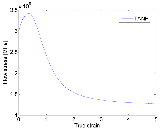 Johnson–Cook (JC) is the most frequently adapted constitutive law to describe the dynamic mechanism properties (strain hardening, strain hardening rate and thermal softening) of mental material when the elastic deformation transforms to the plastic deformation stage. The JC constitutive law, however, does not take into account the strain-softening of the material under high strain conditions. Cutting Ti–6AL–4V, however, is a high stress and high stress rate process, and JC law cannot describe this process accurately. To solve the problems of JC law, Calamaz proposed a TANH constitutive law which modifies the stress, strain and temperature components of JC law by adding a, b, c, d parameters and a tanh function [20]. Later, Sima M and Özel T introduced exponent r into the TANH constitutive model to further control the tanh function for thermal softening [21]. The TANH constitutive model not only considers the stress softening of the material as shown in Figure 1, but also considers the recrystallization phenomenon. Figure 1 is the flow stress-strain curve with the TANH law.