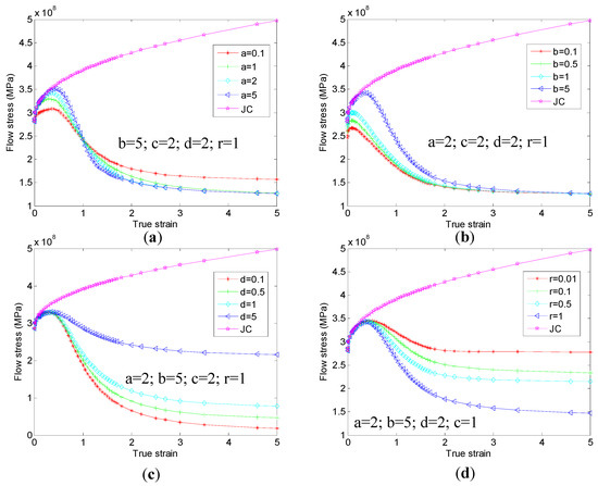 JC strain-stress curve and TANH strain-stress curve with varying value parameters: the strain rate 2000 s−1 ((a): vary parameter a; (b): vary parameter b; (c): vary parameter d; (d): vary parameter r).