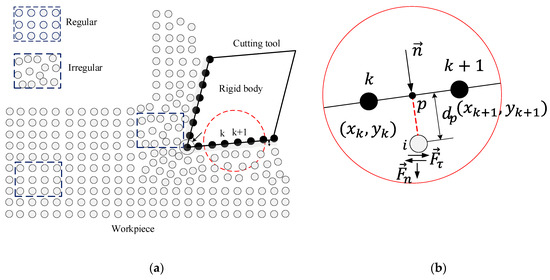 Figure 3b illustrates how the cutting tool and workpiece are regarded as the contact. P is the vertical point from particle i to the surface of the cutting tool. is the actual vertical distance between particle i and the cutting tool. is the contact threshold for these two kinds of particles. When is smaller than , these two particles contact. The tangent vector and normal vector at point are calculated by the following Equation: