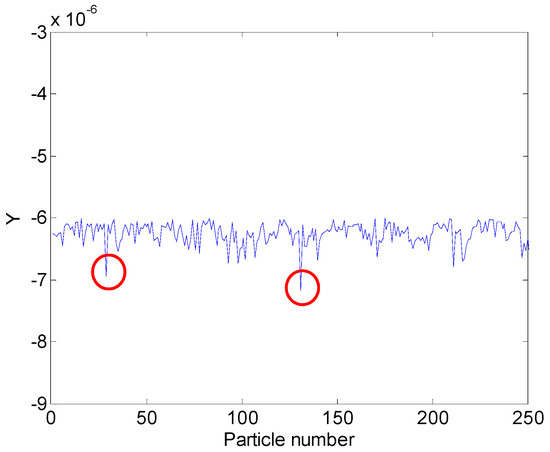 Similar to calculating the surface roughness derived from the vertical distances of measurement points, we extract particles on the simulated surface from the improved SPH cutting model and transform their location information into a coordinate (The SPH cutting model is established in the coordinate system and each particle has the corresponding particle number and coordinate position information. When the surface particles are extracted, the particle number of surface particles are obtained as well as the coordinate information of the particles). Figure 5 demonstrates the particles of the simulated surface after cutting, and Figure 6 illustrates the surface profile of the extracted particles under a coordinate system. We extract the coordinate information of these particles and calculate the surface roughness.