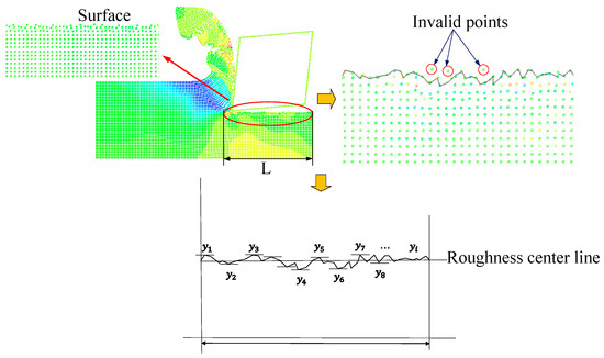 where H is the high value of the workpiece and h is the cutting depth. What is worth noting is, since there is a small amount of random errors in the simulating process, a tiny number of particles deviate far from the center line, which does not conform to the real cutting process (When the distance between a surface particle and the roughness center line is greater than 0.5 µm, we consider this particle deviate far from the center line). Thus, we regard these particles as outliers and remove them when calculating surface roughness. Figure 7 is the steps of surface roughness calculation.