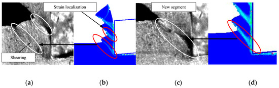 Two stages of a numerical and experimental segmented chip formation: (a) the beginning of strain localization and shearing in the primary; (c) primary shear zone begins to slip [37]; (b,d) the simulation results.