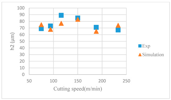 In addition, the accuracy of the cutting model can be verified by the segmented chip morphology and cutting force. We can compare three parameters of chip morphology between the simulation and experiments, such as segmentation width (W), maximum segmentation height (h1) and minimum segmentation height (h2), as shown in Figure 12. The comparisons of simulation and experimental chip morphology are presented in Figure 13, Figure 14 and Figure 15. Table 5 shows the comparison of relative error in simulation and experimental data for segmentation characteristics.