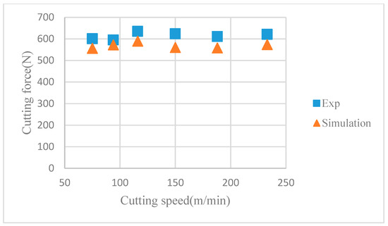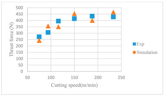 The average cutting force and average thrust force are predicted under different cutting speeds by the improved SPH model. Figure 16 and Figure 17 show the comparison between the simulated results and the experimental results [37]. Table 6 compares the quantitative differences in relative errors between the simulation and experimental results for cutting force and thrust force.