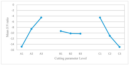 Figure 18 shows the S/N response graph for surface roughness. As mentioned in Equation (25) and Equation (26), a greater value of the S/N ratio will have a smaller variance of surface roughness (the smaller the better).