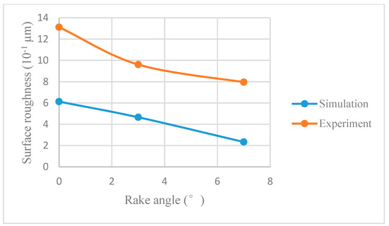Comparison between the simulated results and experimental results under different rake angles (v = 120 m/min, f = 0.1 mm/rev).