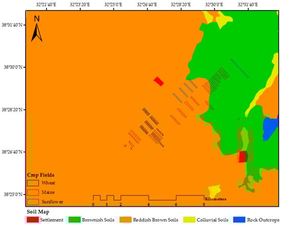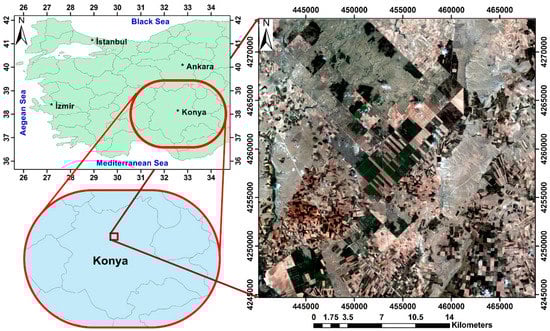 The Konya basin (38° 40′ N, 32° 26′ E) in central Turkey is selected for field measurements and satellite images collection (Figure 1). The terrain of the study area is partly flat with a gently sloping (2%–6%) and, the smallest field area of approximately 0.5 and the largest 18 ha. in size. According to the Ministry of Agriculture and Forestry of Turkey, the distribution of major soils in the study region is Reddish Brown and Brownish soils Figure 2. The soil texture in the study area consists of clayed loam and loamy (medium structure), slightly alkaline, salt-free, and low contents of organic matter (1.30–2.08%).