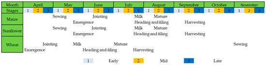 In situ measurements were conducted for maize, sunflower and wheat fields in the spring–summer agricultural season of the year 2016. Crop variables and parameters which indicate the growth rate including crop height and CC were collected simultaneously with the SAR data acquisition, and recorded during the field works. Field data collection includes measuring the row and plant cover by still tape in unit area, taking photographs by the camera and recording field characteristics such as soil properties and irrigation status. For calculating CC, photographs were taken in downward position and perpendicular to the ground with 100 cm distance from camera and canopy outmost in the tillering stage when the crop height was less than 100 cm. Considering the study area, 36 test fields that consist of 19 maize, 6 sunflower fields, and 11 wheat fields were dedicated for this research. The variability of development stages for maize, sunflower and wheat has been defined by applying the “Biologische Bundesanstalt, Bundessortenamt, and CHemische” (BBCH) [20] indicator for each field that generally consist of vegetative and reproductive stages. Seasonal maize, sunflower, and wheat crop calendar of the study area is presented in Figure 4. According to the defined height and CC thresholds, derived from SAR backscattering and BBCH-scale, we call two stages for crops growth season; the early stage and the later stage.