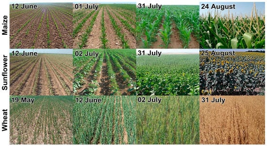 Four field surveys were conducted to obtain accurate ground measurements in late May–mid June, early July, late July, and late August 2016. General growth stages categories (leaf development, stem elongation, heading and flowering), are defined according to the BBCH-scale (Table 1). For calculating the crop height of each test site, five height measurements were obtained and their mean value was calculated to represent the crop height of the relevant test field. From the test sites, plant cover and row were measured and also photographs were captured to determine and evaluate the CC percentage. A synopsis of the maize, sunflower and wheat of different growing stages is given in Figure 5.