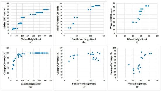 BBCH-scale relationship with crop height (a–c), and Correlation between canopy coverage (CC) and crop height (d–f) for maize, sunflower, and wheat.