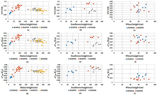 Correlation between (a–c) intensity arithmetic calculation of VV + VH, (d–f) σ⁰VV backscatter, and (g–i) σ⁰VH backscatter values of maize, sunflower and wheat with their height during growing stages.
