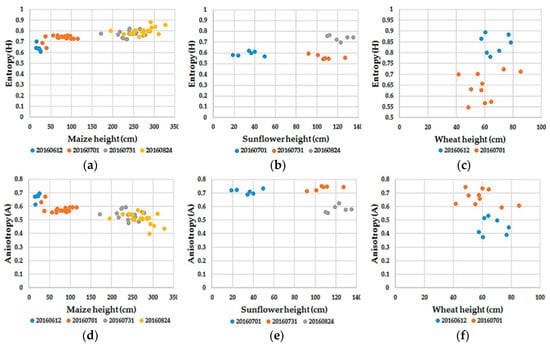 Correlation between Entropy (a–c), Anisotropy (d–f) and Alpha (g–i) decompositions of maize, sunflower and wheat with their height during growing stages.