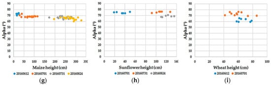 Amongst the H-Alpha decomposition parameters, Alpha (α) decomposition parameter represents the highest correlation (R2 = 0.67) with wheat height during the early growth stage. The maize height is relatively correlated with H-Alpha decomposition parameters at the early stage, although no considerable correlation is observed during the early stage of sunflower and at the later stage of wheat. Figure 9 shows the correlation between the H-Alpha decomposition parameters and crops height of maize, sunflower and wheat.