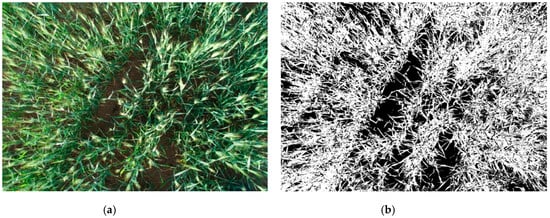 The CC measured in field includes measuring the row and plant cover by steel tape in unit area. For validation of the CC calculated from measured data, photographs were taken using the camera in downward position and perpendicular to the ground with 100 cm distance from the camera lens. The CC extraction process is done by application of Python glob image processing package [46]. The photos are first converted to HSV (Hue, Saturation, and Value) model and used as a detector for the type and shape and to do color constancy processing by grouping or classifying the image. Following the HSV conversion green mask is applied to slice the green areas as white ratio and black to the bare soil. The sample classified green area for wheat is given in Figure 10. The unit area from the photograph is calculated using the ground sampling distance (GSD) formula and setting calibration derived from images. The contributing parameters for determination of ground resolution are the camera’s height above the ground, the camera’s pixel size, and the lens’ focal length.