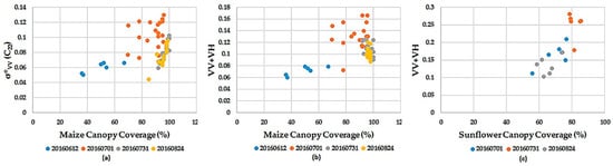 Scatterplots (d–f) in Figure 6 show SAR response to crop heights. Note that the sensitivity of the SAR backscatter to CC of three different crops has been changed in different height and CC in each crop. For maize, the variation of correlation was determined when the maize CC threshold is 75%. This threshold is 85% and 60% for sunflower and wheat respectively.