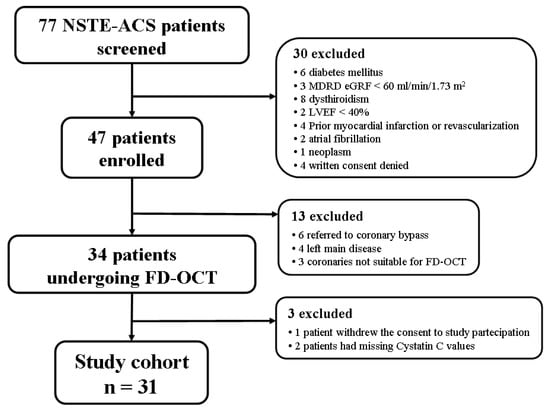 - Imai, A.; Komatsu, S.; Ohara, T.; Kamata, T.; Yoshida, J.; Miyaji, K.; Shimizu, Y.; Takewa, M.; Hirayama, A.; Deshpande, G.A.; et al. Serum cystatin C is associated with early stage coronary atherosclerotic plaque morphology on multidetector computed tomography. Atherosclerosis 2011, 218, 350–355. [Google Scholar] [CrossRef] [PubMed]