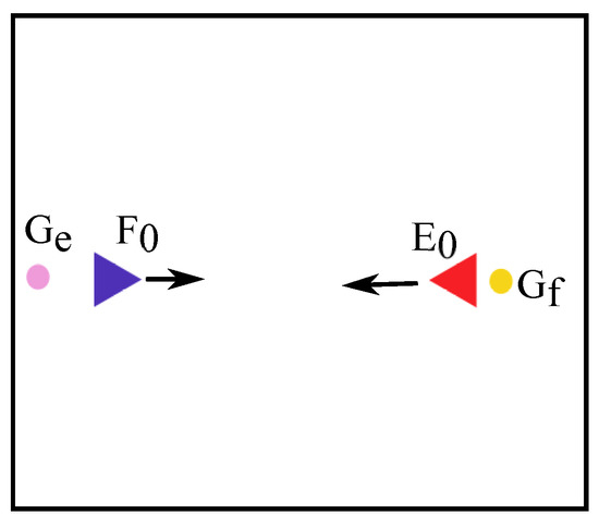 For the convenience of the research, we define the enemy avoidance problem in a fixed region. There are two UAVs flying toward each other in the region, namely the decision making UAV f and the enemy UAV e. The fixed region is where the two UAVs may collide with each other. The decision making UAV f enters the region from the left side, while the enemy UAV e enters the region from the right side. Both UAVs are flying toward their own goal points. Let and denote the goal point of the decision making UAV f and that of the enemy UAV e, respectively. The goal point for the decision making UAV f is located near the right edge of the region, while the goal point for the enemy UAV e is located near the left edge of the region. Both goal points are on the middle line of the region, as shown in Figure 1.