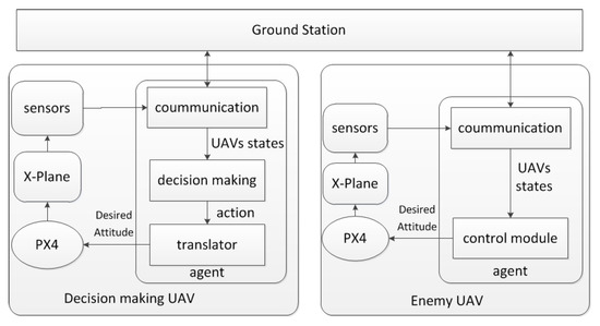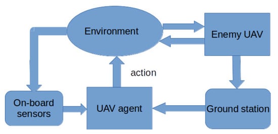 To arrange an appropriate action sequence is the process of decision making, which is also the main focus of this work. In decision making, such an action sequence is called the policy. Based on the action chosen by the on-board agent at each decision making step, the decision making UAV can adjust its flying attitude or attack the enemy UAV. The agent makes decisions based on both its own information from its on-board sensor system and the enemy UAV’s information from the ground station. The action executed by the decision making UAV makes the UAV changes its state in the environment. On the other hand, the enemy UAV also updates its states in the environment and senses its own states from the environment with its on-board sensor system. The ground station captures all UAVs’ information, and then transmits the information to the decision making UAV. Figure 2 presents the overall decision making process of the enemy avoidance problem. Therefore, how the decision making agent uses the gathered information to make decisions for avoiding collision with the enemy UAV is what this paper is going to solve. Furthermore, the time and the location at which the enemy UAV enters the region are not fixed each time. Therefore, the decision making ability of the decision making UAV should be able to generalize to different enemy avoidance cases.