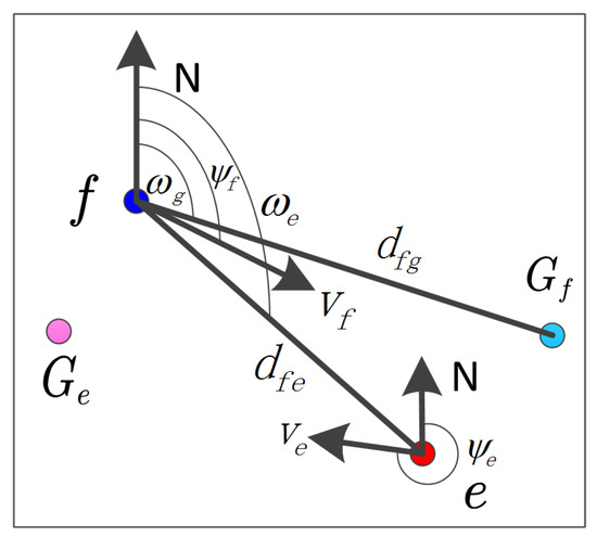 - : The angle between the north direction and the line from the decision making UAV f to the enemy UAV e.