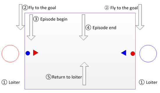 On the other hand, the enemy UAV simply flies toward the goal point with constant velocity and heading angle if the decision making UAV does not collide with it or attack it successfully. The scenario is supposed to end as soon as the decision making UAV has collided with or successfully attacked the enemy UAV, or the decision making UAV has reached the goal point successfully or has been out of the region.