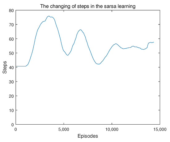 Figure 8 shows how the number of steps for each episode changes as the number of policy learning episodes increases. The figure is also drawn with data filtered by a window of 1000 episodes. In Figure 8, the number of steps fluctuates very much at the beginning, but converges to a relatively small number as the number of episodes increases, and it comes to a plateau after around 10,000 episodes.