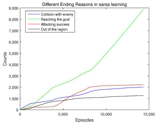 Figure 15 presents how the numbers of episodes ending for different reasons change when the policy learned with the Sarsa based framework is adopted. Different from the other two policies, there is only one main ending reason: reaching the goal point. The numbers of episodes ending for both collision with the enemy UAV and attacking the enemy UAV are sharply reduced in the learned policy, and can be neglected when compared with that of the reaching goal case. Obviously, the policy learned with the Sarsa based framework can successfully guide the decision making UAV reaching the goal point.